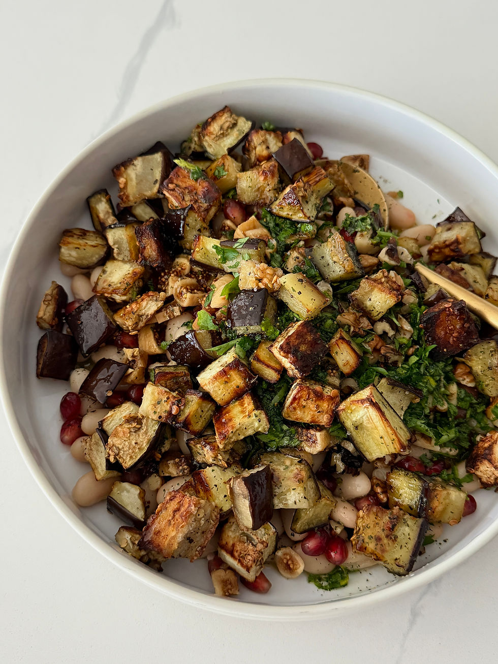 This recipe was definitely an accidental ode to my Syrian roots. I've realized over time that you really are your ethnic roots -- you can't escape them! This is my Roasted Eggplant & White Bean Salad, dairy free and vegetarian, it's one of the easiest recipes I've made in this series.